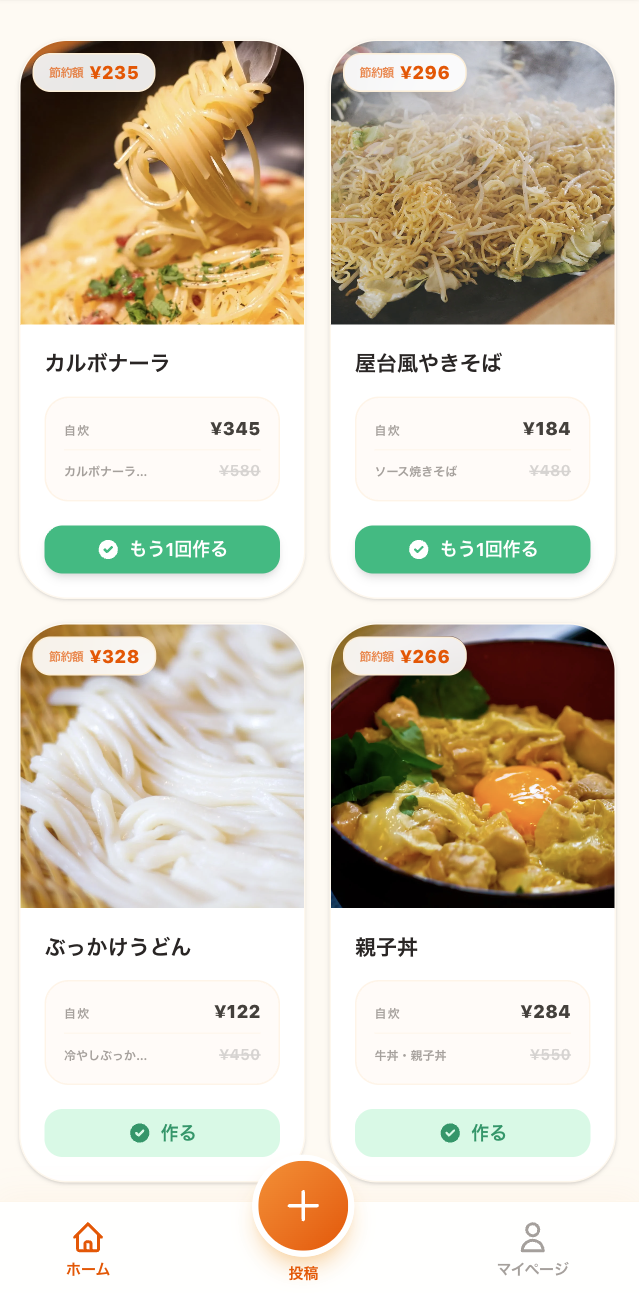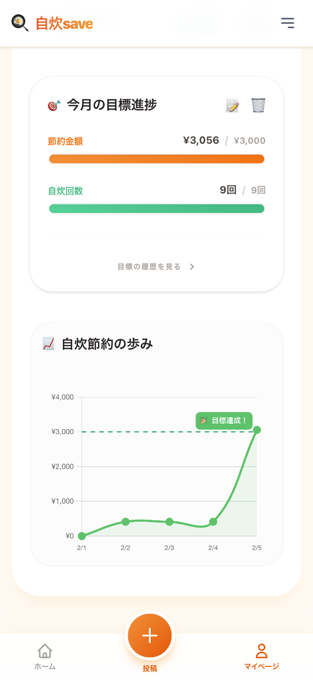 グラフの表示で、「これだけお得になった!」「頑張って自炊できている!」というのが一目でわかるので、楽しく自炊を続けられます!