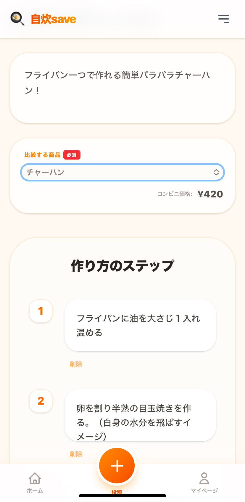 投稿画面で、作りたい料理に近いコンビニ商品やお弁当を選びましょう。