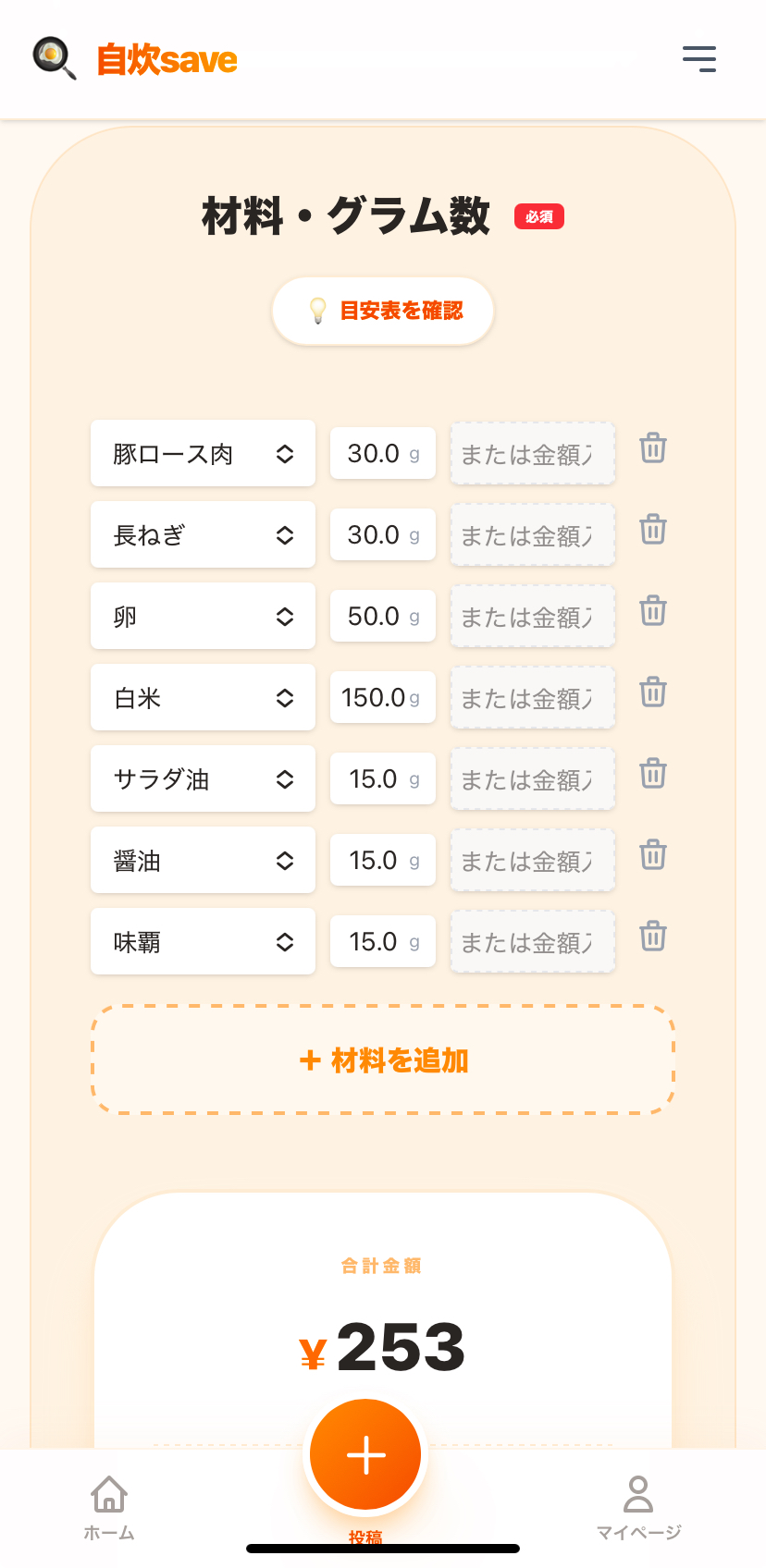 使った材料と重さを入力すると、自動でコストを算出。「目安表」を使えば、計りがなくてもざっくり計算できます!