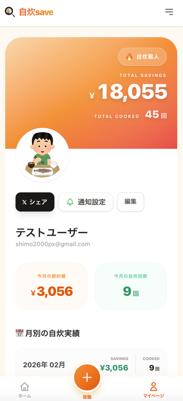 プロフィール画面では、自炊記録の他に様々な機能が使えます。
